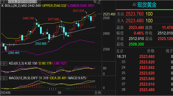 均线指标多头排列,配合日内美元指数下跌,黄金价