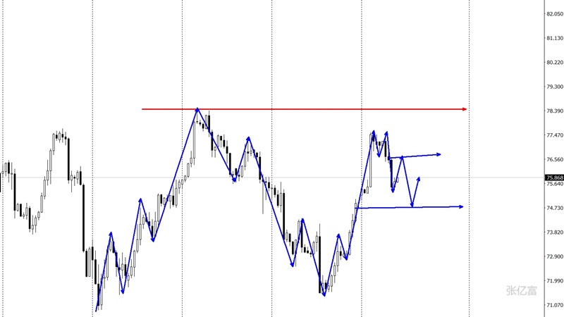 油价在上方的压力位受阻回落,晚间到达下方75.30一线。目前从图中可以清楚的看到短期已经打破原先的上升通道,即将转为下跌走势,在前期底部位置的时候突破底部压力一路反弹,宽幅中依然还在78.90下方运行构不成反转,短期继续回归下跌的可能性比较大。综合以上分析,张亿富认为:原油介于前几次上涨后回撤转跌的形态,油价
