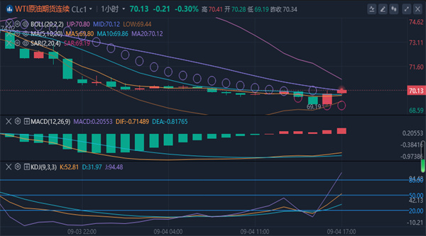 K线连续连续两个交易日收大阳线,预示多头动能逐渐强势起来,预计中期走势仍将在区间内反弹向上运行。原油短线(1H)走势呈触底反弹节奏,油价仍受到均线系统的压制,短线客观趋势方向向下。从动能看,多空在相互胶着中,油价在底部有望形成次要震荡区间,预计日内原油保持底部低位调整节奏,仍以看空思路为主。原油策略:触及69-68.5区域做多,破68损,目标70-71-72.5;高位空单临盘给出提示。