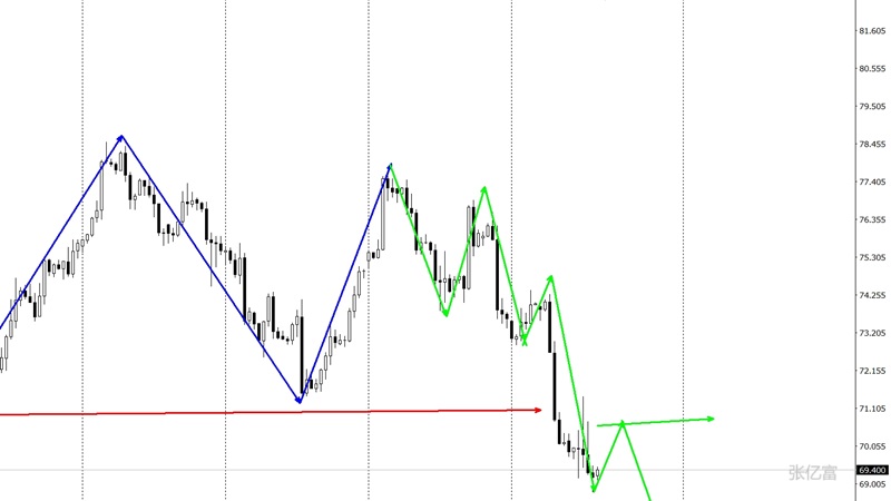 (美原油(美原油06,94.12,-3.91%,模拟交易)05,101.46,-3.38%,模拟交易)延续承压中。4小时图反测破低口71.40一线继续承压下挫收低,目前处于破位后的弱势延续,空间有望进一步展开,昨日在71.0-70.50间做空仍有所斩获。今日操作依托反测点也是破低口的重合阻力71.40做防守点继续看空。综合以上分析,张亿富认为:原油持续空头发力中,后市关注趋势延续,今日操作上考虑反弹做空为主,低多为辅,上方关注71.0-71.5美元阻力,下方关注68.5-67.5美元支撑。