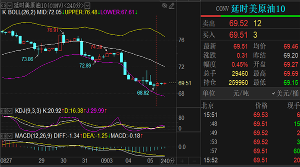 (美原油(美原油06,94.18,-3.85%,模拟交易)05,101.55,-3.29%,模拟交易)价格上半周连续下跌,那么下半周就会走反弹修正,反弹力度可以能会超乎预期。目前1小时布林带三轨平行发展,上轨承压70.4,下轨支撑在68.8一线,日线先看这个区间的运行情况,刘铭诚个人偏向触底反弹,晚间更是能突破昨日高点71.4位置。