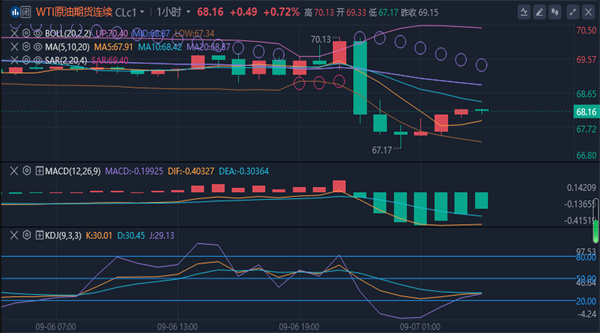 【原油技术面分析】:原油今日出现了低开低走冲高回撤走势,在71.448美元一线再次承压下跌,最低点触及69.5美元徘徊中。原油日线走势图上看,日线收录一根大阴线,低位破新低,高位没有破新高,出现了破位走势,后市延续看跌思路。4小时布林带三轨和各个周期均线都是向下发散,且日内价格刷新低点来到69.2位置,短期内下方能参考的支撑节点就是68.0和64.0区域支撑范围。综合以上分析,:原油空头下破新低,空头趋势有望延续,后市操作上考虑反弹做空为主,低多为辅,上方关注70.8-71.6美元阻力,下方关注68.0-67.0美元支撑。