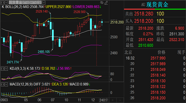 (沪金2606,1035.30,1.49%,模拟交易)格触及2522一线转跌,昨天的价格低点还是坚守住了2500关口,而上方的阻力也是压制在2528一线,这就是今日的宽幅震荡区间。技术面来看,目前1小时、4小时和日线周期的SAR抛物线指标都处于低位向上发散,白盘来看