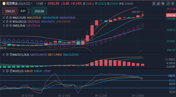 【黄金技术面分析】:4小时方面,黄金运行的是一个低点抬升,高点创新高的多头走势,操作上还是要顺势跟进多单,从当前走势来看,黄金再一次沿着布林带中轨一路上行,多头强势依旧,那么大方向沿着布林带中轨继续做多上看。从1小时图来看,黄金冲击2555一线位置,