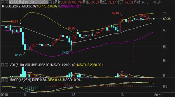 油价格突破周初高点69.1位置,实时现报价69.3一线,欧盘的震荡区间暂定1小时布林带上下轨70-68.4运行,