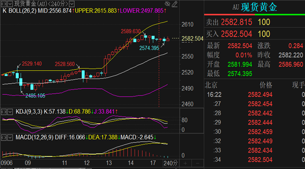 昨天的低点在2475,而今早的低点来到2574,这就是个看跌信号,晚间的行情走势有望考验箱体下轨2568一线。今日阻力方面关注1小时布林带上轨2587和昨日高点2589形成的压力范围,周线布林带上轨承压2592一线,周线误差带上轨阻力位还是在2600关口,4小时布林带上轨与昨日点位有偏差,上移来到2610一线,但从开口转变为收口阶段。今日思路可以参考4小时图形中SAR抛物线指标来定涨跌,目前完成顶底转换出现在高位向下发散,刚好位于2589高点位置,