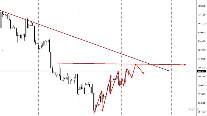 短线留意4小时结构中的三角区间破位,以中轨69.8做多头防守。综合以上分析,张亿富认为:原油探底回升,在阻力位回落,但是