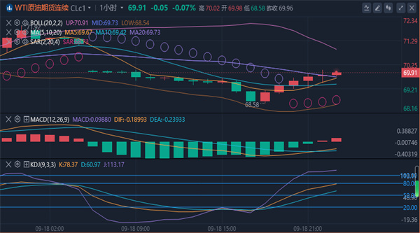 均线70.21和10日均线69.10附近支撑。如果油价能够站稳在71.46上方,则有望进一步打开新的上涨空间,中线目标参考200日均线75.71附近位置。原油日线一波连阳式低位反弹,短期进入宽幅震荡。4小时图依托中轨走出一波持续性的反弹,目前是二浪反弹当中,上方接近下行趋势线的阻力,面临关键选择点。多空持续性是个问题,短线留意4小时结构中的三角区间破位,以中轨做多头防守,下行趋势线为空头防守,破位延续的行情,操作上结合形态放到欧盘后再临盘安排。综合来看,原油今日短期操作思路上以回踩低多为主,反弹高空为辅,上方短期关注71.5-73;一线阻力,下方短期关注69.0-68.5一线支撑。
