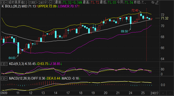 今日阻力方面关注昨日高点72.3位置,上方的阻力还是看周线MA10均线73.3和9月份的月线高点74.3两个阻力节点。支撑方面留意71关口,其次是本周低点69.4和前期低点68.4两个支撑节点。整体来看原