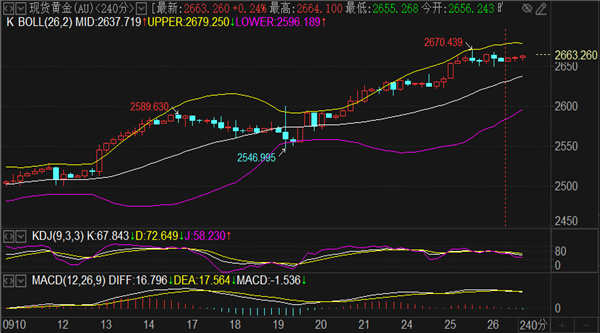 短线来看1小时布林带上下轨平常发展,空间没有打开,暂时关注上轨2664和下轨2654震荡盘,若欧美盘黄金