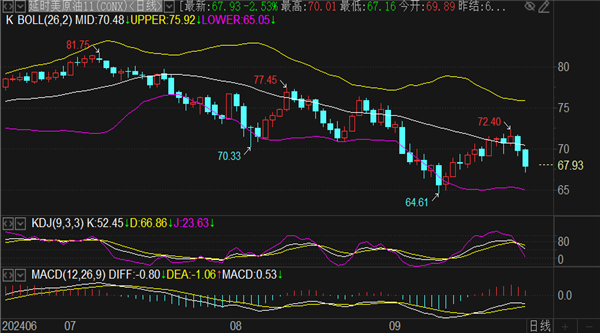 周四原油亚盘单边下跌,低点触及周线布林带下轨67.1止跌反弹,实时现报价67.9一线。盘面上直观的感受就是月线大阴线难以改变,且周线MACD还是绿色量能阶段,今日白盘突然下跌,让原
