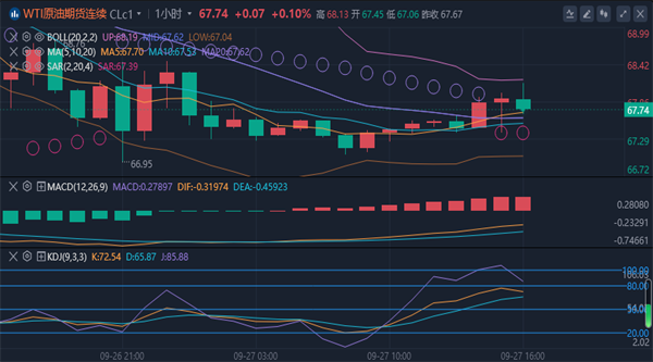 美原油目前下跌0.5%,交投于67.30美元/桶附近。布伦特原油