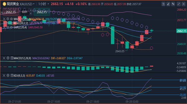 (美黄金06,4640.4,2.20%,模拟交易)窄幅震荡,目前交投于2662.36