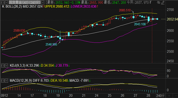 今日阻力方面关注早盘高点2665和1小时布林带上轨2670,周线布林带上轨2675和4小时上轨2678算是压制阻力范围,偏差防守阻力看高点2685位置。支撑方面留意4小时下轨2645和1小时下轨2642形成的支撑范围,向下偏差防守看2635位置,本周初的极限防守支撑节点看4小时MA60