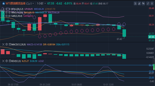 【原油技术面分析】:原油市场昨日小幅低开在69.17美元/桶,后行情先回落给出68.52美元/桶,后行情拉升,日线最高触及到了69.94美元/桶,后行情承压回落,日线最低给到了68.2美元/桶,后行情整理,日线最终收线在了68.93美元/桶,后行情以一根上下影线等长的纺锤形态收线,而这样的形态收尾后,原油延续承压中。四小时级别上,布林线中轨阻力等关键位置附近受阻后持续回落,KDJ死叉良好运行,MACD红色柱萎缩,短线油价