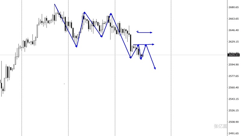 运行在中下轨下方徘徊,黄金在上方三角震荡后,出现了下破走势,目前处于一个承压下跌格局中,上方强弱转折点在2652一带,同时昨日高点2624美元阻力位将视为今日重要打压范围。综合以上分析,张亿富认为:黄金出现了震荡下破,空头有望延续,今日操作上考虑反弹做空为先,低多为辅,上方关注2621-2626美元阻力,下方关注2600-2590美元支撑。