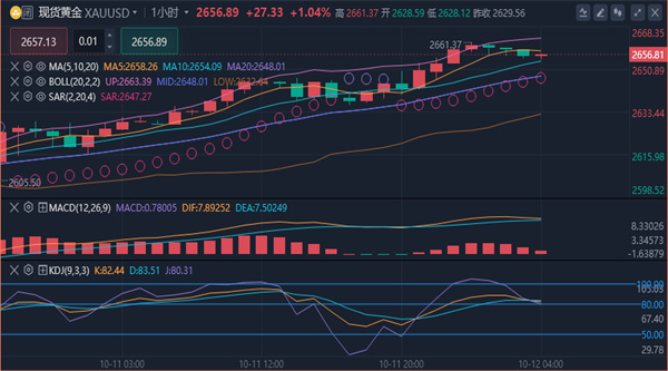 【黄金技术面分析】:技术层面,日线图上,黄金仍处于高位区间小幅整理之中,技术指标MACD形成死叉,相对强弱指数(RSI)开始自超买区域回落,短期显示黄金头部较重。如果金价跌破9月30日低点2624