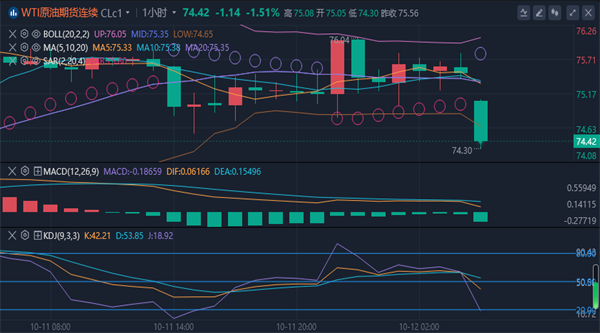 【原油技术面分析】:原油上周出现了窄幅震荡中,在74.4美元一线企稳徘徊,高点在75.8美元一线徘徊中。原油日线级别上看,油价在两阴柱之后收大阳柱,表明了大跌后大涨,多头回归的迹象,本周周重点关注多头是否延续上探。四小时级别上看,油价呈区间震荡徘徊中,