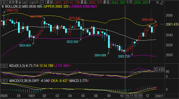 金价格突破上周高点2661阻力,日内高点触及1小时布林带上轨2666一线,刘铭诚这边也是及时给出2666空单,目前持有等待欧盘。技术面来看黄金