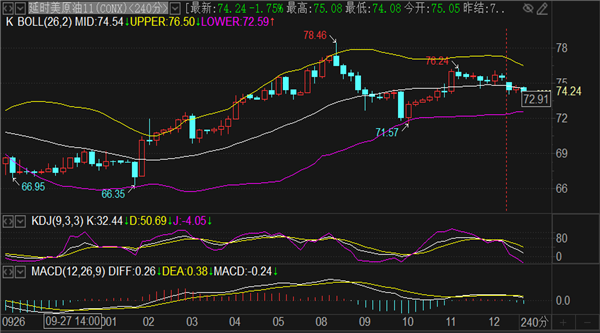 均线粘合压力点74.9下跌,实时现报价74.2一线。今天的波动预计不会很大,温和震荡区间暂定75-73震荡整理,破位后再看行情延续。今日阻力方面关注75关口,1小时布林带上轨76和4小时布林带上轨76.3算是防守压力范围,如若向上破位76.3就会续涨考验月线中轨77.6压制点。