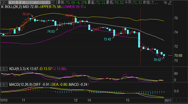 油价格暴跌,实时现报价70.5一线。昨天提示的72.4阻力转支撑节点,现在再次变成向上的压制点,日内原油