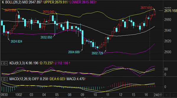 (美黄金06,4603.8,1.40%,模拟交易)日内上涨高点触及2677一线,今日行情走势预测=亚盘单边上涨—欧盘遇阻回撤—美盘再看上行——凌晨高位接空单,能不能暴跌晚上再看。技术面来看,黄金突破1小时上轨2676后,更上方的阻力看2680-83区域,日线布林带上轨承压2689位置,如若突破2690,更上方的阻力参考2700关口和日线误差带上轨2718两个节点。对于今日走势刘铭诚并不看好突破新高,整体思路防守高位阻力节点做空为主。