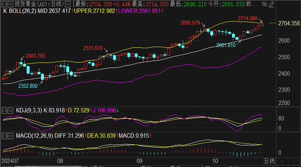 黄金实时行情分析:技术面来看,目前的能看到的阻力范围就是日内高点2713-15区域,如若向上破位基本上就看不到阻力点,上方的压制区域只能参考周线布林带上轨2727-2732范围。后市如何我也说不准,但是黄金价