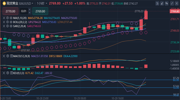 短线震荡偏强格局,目前上方较近阻力在2775-2780附近,再上方就是2785布林带上轨压力,从波浪结构来看,当前行情处于4小时级别3-5浪,且3-5大概率接近尾声,说明上方空间已不再适合追多,目前需要等待上方出现一个长上影K或者大阴承压信号来结束这波上涨浪,开启4浪回调。因此,短线来看继续看区间震荡,上方留意2780-2783附近压力,下方关注2760-2755附近支撑位。
