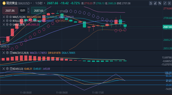 均线还是在空头向下发散排列,目前还没有拐头的迹象,所以说黄金还不能直接说就要反转了,黄金1小时均线阻力现在下移到2708附近,如果数据后强势突破站稳2710,那么黄金行情可能才会出现反转。今日黄金短线操作建议以回调做多为主,反弹高空为辅,上方短期重点关注2700-2705一线阻力,下方短期重点关注2680-2675一线支撑。