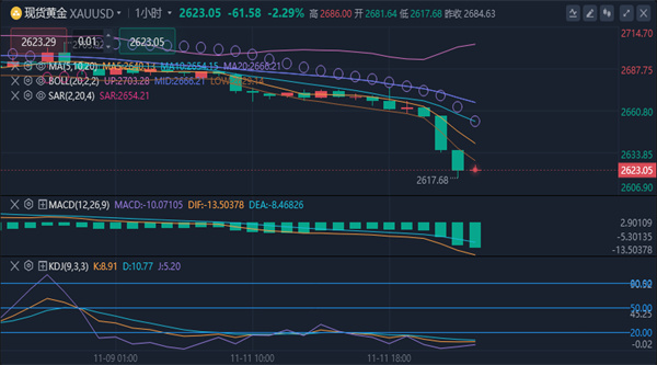 美元,失守2640美元/盎司,为10月中旬以来首次,日内跌幅1.67%。现货黄金日内大跌2.00%,现报2630.75美元/盎司,创10月11日以来低位,日内跌约50美元。