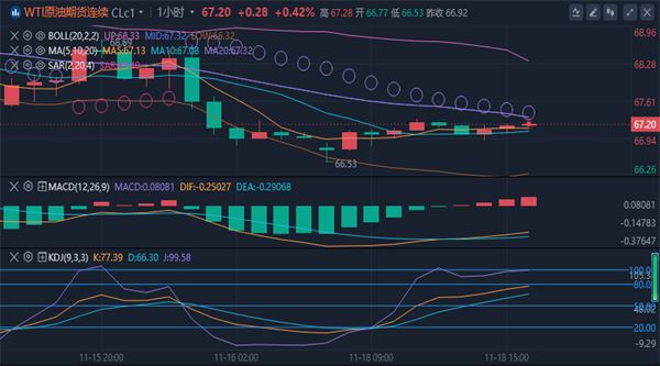 油价低位调整中。原油4小时级别显示,油价