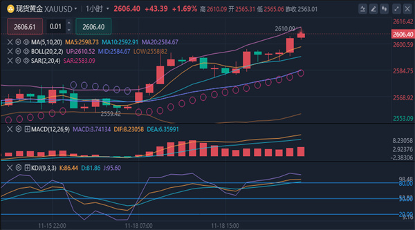 金价上涨1.58%,报2610.00