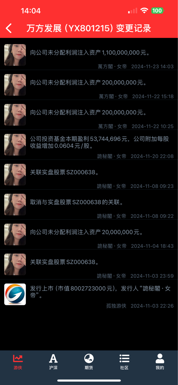 2 (万方发展YX801215,11.99,1.61%虚拟买入)股票基金将是纯公益基金,在每个期货日董事长会去注入利润 最低 1-2 亿游侠币,一个月大概会注入利润 60 亿左右游侠币! 目前 2 天共计注资利润 :4 亿游侠币,今天天然气期货大赚,注入 11 亿,共 15 亿游侠币!作为持股(万方发展)股票股东分红!分红暂定10天一发, 众人拾柴火焰高,希望后面有更多有能力的玩家可以参与捐赠帮助很多人! 1-2 亿也就几次期货手续费不难!