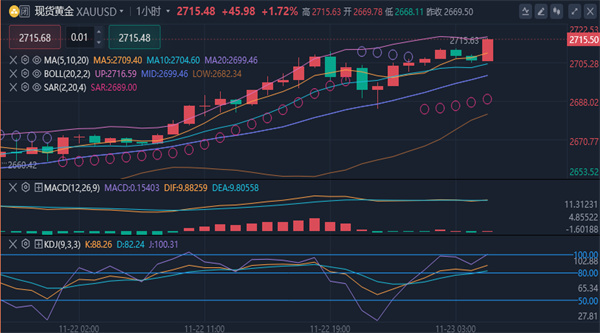 慢牛上升的形态,并且是阶梯式的上升格局,而且这种形态预计还会继续维持下去。从指标层面来看,随机指标和 MACD 指标目前均呈现出金叉状态,并且呈现出震荡向上运行的态势,这些都是持续利多的信号。综合形态与指标两方面的情况来看,4小时图整体上是偏向于持续震荡向上运行的。就压力位置而言,上方需要重点关注的是2750-2760这一区间,而最为关键的压力位置则是在2790。在下方,短期则要重点关注2700-2690这一线所形成的支撑区域。综合来看,黄金回撤2710-2705附近多,目标2728-2740-2756;若首次给到2730-2735附近可空;