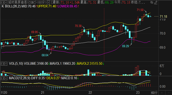 原油实时行情分析:原油市场昨日开盘在69.0美元/桶,日线最低给到了68.84美元/桶,随后行情直线拉升,日线最高触及到了70.36美元/桶,当前原油延续震荡蓄力中。原油四小时级别上看,布林带是上中下三轨都是向上,形成了一个上冲通道,目前k线是收到布林带中轨的压力,正在尝试突破。