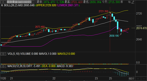 均线位置2684一线,其次是1小时中轨2694,更上方看2703压制点,只要2703没能突破,黄金就不会延续上涨,若突破则回归涨势。支撑方面留意日内回撤低点2658一线,更下方留意2645和2626两个支撑节点。近期行情涨跌幅度极大,上周的涨幅是2023年3月以来的最佳周线表现,而今天周一白盘也出现了单边63个点的暴跌,交投严格设置好