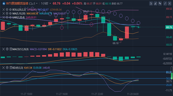 美元/桶,后行情先拉升,日线最高触及到了70.43美元/桶,后行情冲高回落,日线最低给到了68.15美元/桶,后行情整理,日线最终收线在了69.07美元/桶,后行情以一根上影线稍长于下影线的长脚十字星形态收线,这样收尾后油价