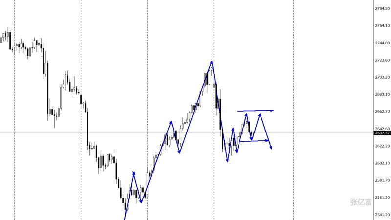 徘徊于中轨区域,在反弹2658美元收录上影线形态后,黄金可能出现再次承压的概率,下方支撑在2604一带,继续下破后有望出现三浪加速阶段。综合以上分析,张亿富认为:黄金冲高回落,表明上方阻力位较强,后市有望出现区间下破,操作上考虑反弹做空为先,低多为辅,上方关注2645-2658美元阻力,下方关注2620-2604美元支撑。