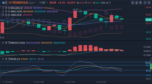 (美原油(美原油06,96.26,-1.73%,模拟交易)05,102.94,-1.97%,模拟交易)技术面分析】:原油市场昨日开盘在69美元/桶,后行情先回落给出68.68美元/桶,后行情拉升,日线最高触及到了69.48美元/桶,后行情快速回落,日线最低给到了68.26美元/桶,后行情整理,日线最终收线在了68.89美元/桶,后行情以一根下影线长于上影线的十字星形态收线,而这样的形态收尾后,原油继续承压中。四小时级别上看,原油布林带处于宽幅震荡缩口迹象,