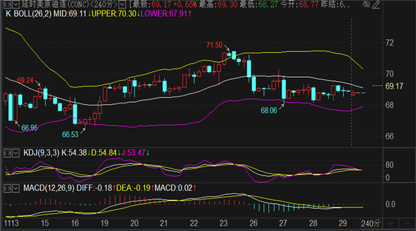 技术面上来看4小时布林带三轨平行发展,下轨支撑68.3,上轨阻力69.5,短线先看这个区间运行情况。目前1小时和4小时SAR抛物线指标都处于低位向上发散,个人偏向原油