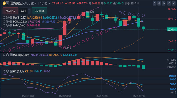 美元/盎司,最高触及2720美元/盎司后迅速下跌,最终收盘于2650.26美元/盎司,涨幅0.48%。市场经历了从亚洲和欧洲市场的温和复苏到北美市场的剧烈下跌,最终在感恩节假期期间相对平静,价格在2620至2656美元/盎司之间波动。