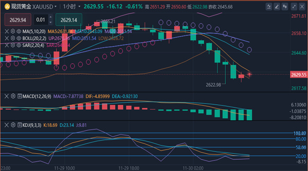 慢牛爬坡式上升,可市场规律警示“碎阳之后必有大阴”,慢涨爬坡后出现回落乃是大概率事件。当前仍处于上升后的修正周期,上周周线收阴,反弹节奏被打断,市场短期内难回强势,震荡修正将成“主旋律”。早间开盘黄金就直接开跌,短时间下跌了30个点,直接跌穿2630的支撑,当前关注2620一线支撑,这是感恩节假期下跌的低点,黄金感恩节也是从该位置一路上行,其次2605附近的支撑情况。日内短线,震荡看跌是主思路。综合来看,今日黄金短线操作思路上反弹做空为主,回调做多为辅,上方短期重点关注2640-2645一线阻力,下方短期重点关注2615-2610一线支撑。
