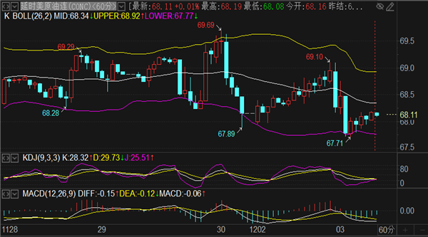 原油周一高点下移至69.1附近,而尾盘低点刷新到67.7一线,周二和周三,有望顺势下行考验67甚至66关口,目前1小时布林带三轨平行发展,早盘区间暂定67.5-69,上下各预留5个点偏差对待;日内原油