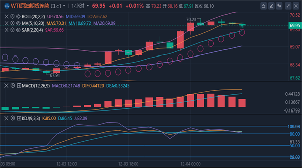 【原油技术面分析】:原油市场昨日开盘在68.06美元/桶,后行情先拉升,日线最高触及到了69.18美元/桶,后行情回落,日线最低给到了67.78美元/桶,后行情整理,日线最终收线在了68.23美元/桶,后行情以一根上影响极长的倒锤头形态收线,而这样的形态收尾后,油价