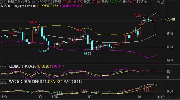 均线压力点就是在70关口,日线MA5均线承压70.5位置,向上阻力看71.2压制点。