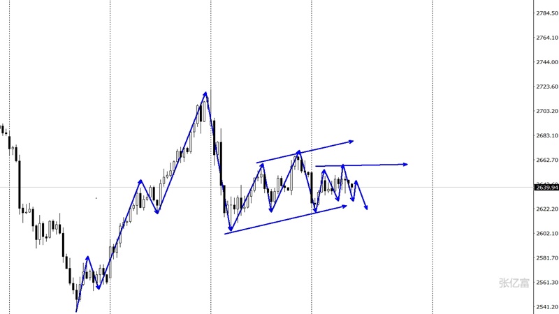 延续承压中。4小时图的结构也几乎与昨日无变化,高点稍微上移了一点,但符合昨日给出的区间。布林道收口当中,今日的思路与昨日同步,围绕布林道上下轨之间收缩震荡,宽幅区间2665-2605有待突破。综合以上分析,张亿富认为:黄金维持在宽幅震荡中,今日操作上考虑高空低多策略,上方关注2655-2666美元阻力,下方关注2633-2620美元支撑。