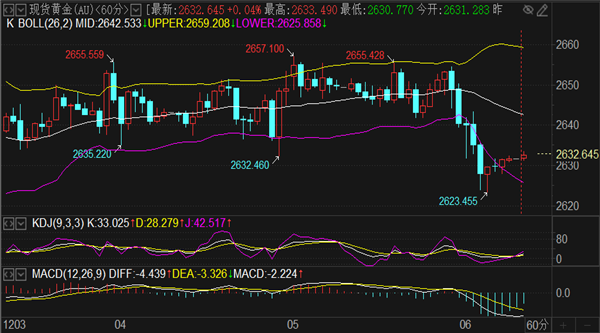 (美黄金06,4592.2,1.14%,模拟交易)低点触及2623止跌反弹,而美指价格跌至收盘,早盘黄金平开慢涨,刘铭诚预计涨跌力度不会很大,能触及2640-42区域可再次做空。