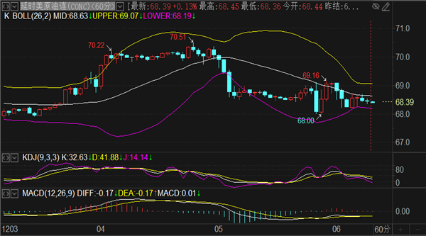 (美原油(美原油06,96.12,-1.87%,模拟交易)05,102.75,-2.15%,模拟交易)价格平开,反弹可参考68.8-69区域做空看68破位持有。