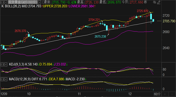 早间9点30分,黄金现报价2701一线,2716的空单离场了,高位2721空单持有,理想的位置是1小时布林带下轨2687和日线MA5均线2682范围离场,当然能跌破更好。周初三天上涨幅度达到99个点,早间高点触及2726位置见顶回落,既然凌晨起涨点2710已经跌破,1小时SAR抛物线指标顶底转换出现在高位,同步的1小时MACD上涨量能逐步减弱,刘铭诚预计日内还会走延续下跌修复指标。