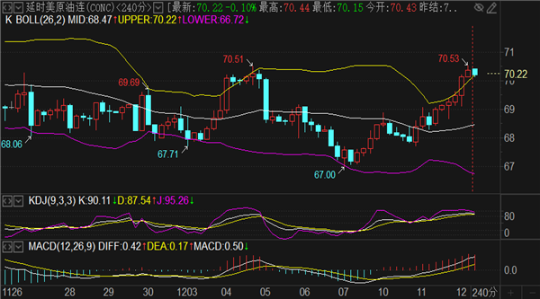 原油69.9空单和70.4补仓空单持有中,实时现报价70.1一线。目前1小时SAR指标转换到高位向下发散,这两个单子持有看下破就行了。日内阻力关注月线MA60均线71关口和周线布林带中轨71.3形成的压制范围,刘铭诚预计触及是能大胆做空的,最多向上预留5个点偏差防守即可。支撑方面留意4小时MA30均线和MA200均线交叉支撑点69.2位置,其次关注1小时布林带下轨和4小时布林带下轨重合支撑点68.6一线,这是常规的震荡范围,如若向下破位68.6才会打开下行空间,更下方关注67.6和66.6两个支撑节点。